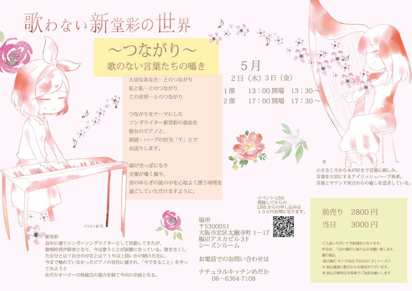 前売り ¥2,800 当日 ¥3,000 この公演はお子様の同伴についてはご遠慮ください。 出演…Pf.新堂彩+朗読・Harp.千